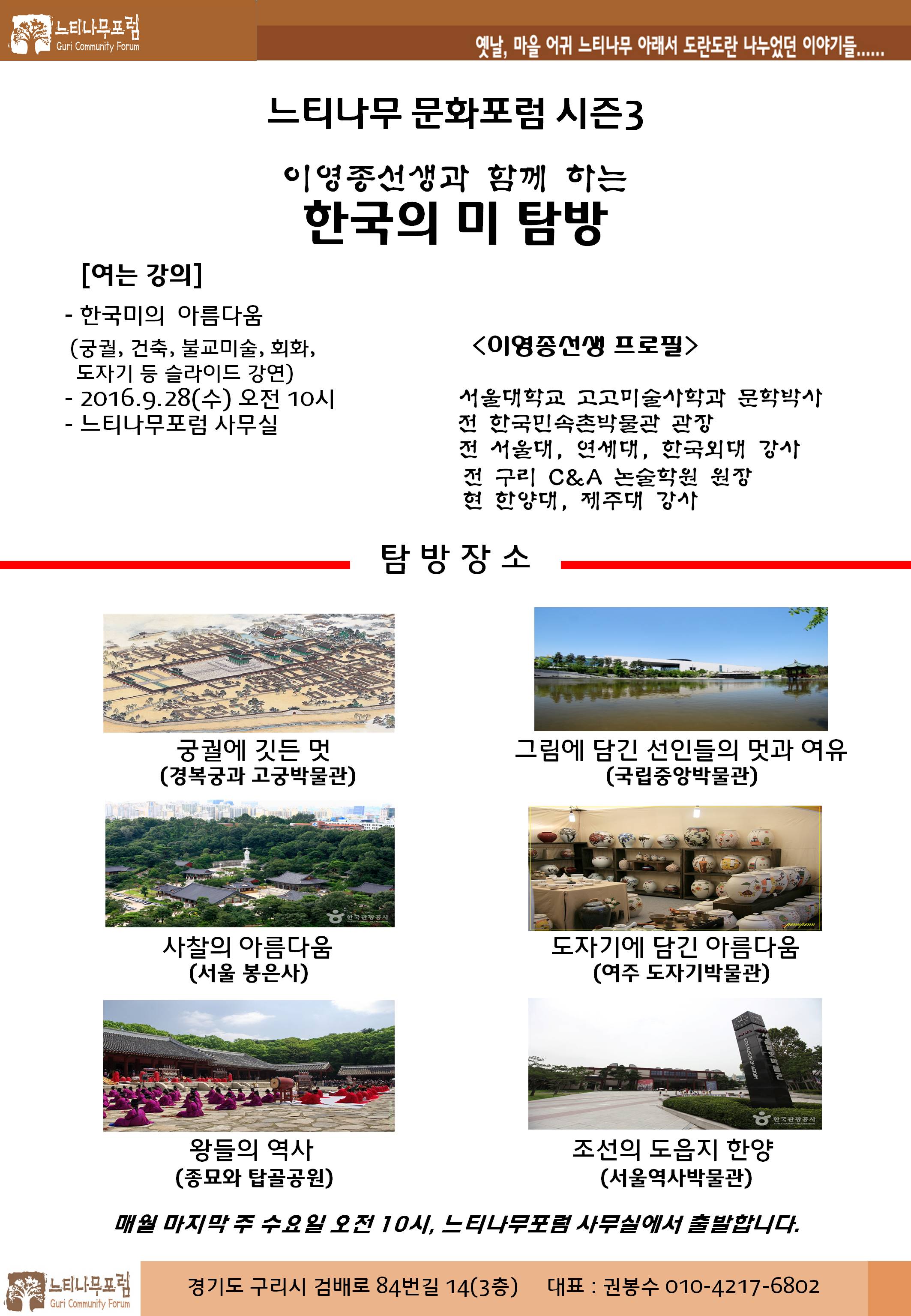우리 문화에 관심 있는 사람은 누구나 참여할 수 있으며, 26일 오전 10시에 구리에서 관광버스로 출발한다. 참가와 관련한 문의사항은 느티나무포럼 권봉수대표(010-4217-6802)에게 하면 된다.