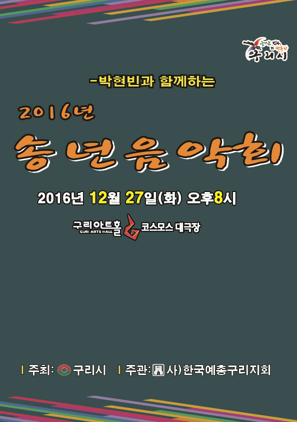 구리시(시장 백경현)는 다사다난했던 한해가 저물어가는 연말연시를 맞이하여 오는 27일 오후 8시에 구리아트홀 코스모스 대극장에서 가수 박현빈과 함께하는‘2016. 송년음악회’를 개최한다.