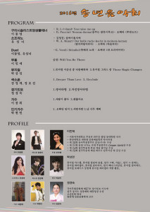 이날 음악회는 (사)한국예총 구리지회 주관으로‘곤드레만드레’‘오빠만 믿어’‘샤방 샤방’등 다수 히트곡을 발표한 인기가수 박현빈을 비롯하여 성악가 테너 이동명, 소프라노 이민애와 경기민요 정경숙, 뮤지컬 배우 박상언, 대중가수 이창휘, 무용가 이민애 등이 출연하여 가는 해를 장식하는 풍성한 공연이 펼쳐진다.