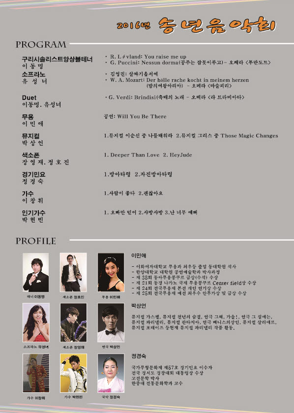 이번 2016. 송년음악회는 차분한 분위기 속에서 송년의 정을 나누고, 다가오는 정유년(丁酉年)의 시민화합의 장을 마련하고자 기획하였으며, 전석 무료로 선보일 예정이다.