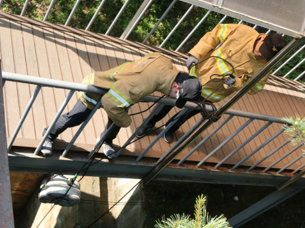 소방대원이 소방호스를 매고 달리고 있다 news-i
