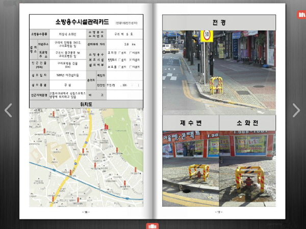 소방용수시설 E-Book은 ▲설치장소(주소 및 지도) ▲관리자(담당자 및 인근 주민) ▲시설주변 대형화재 취약대상 ▲인접한 기타 소방용수시설 ▲수리표지판 설치여부 등으로 구성되어 있다.