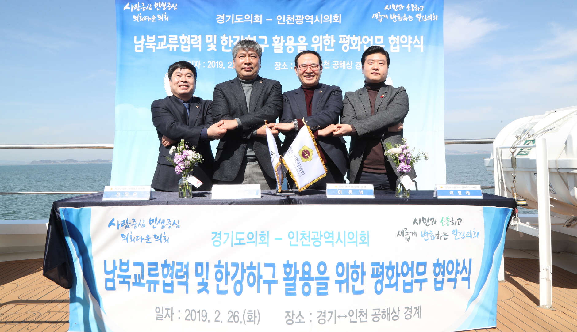 송한준 경기도의회 의장(더민주, 안산1)은 26일 영흥도 앞바다 경기바다호 선상에서 이용범 인천광역시의회 의장과 ‘남북교류협력과 한강하구 활용 공동추진을 위한 평화업무협약’을 체결했다.