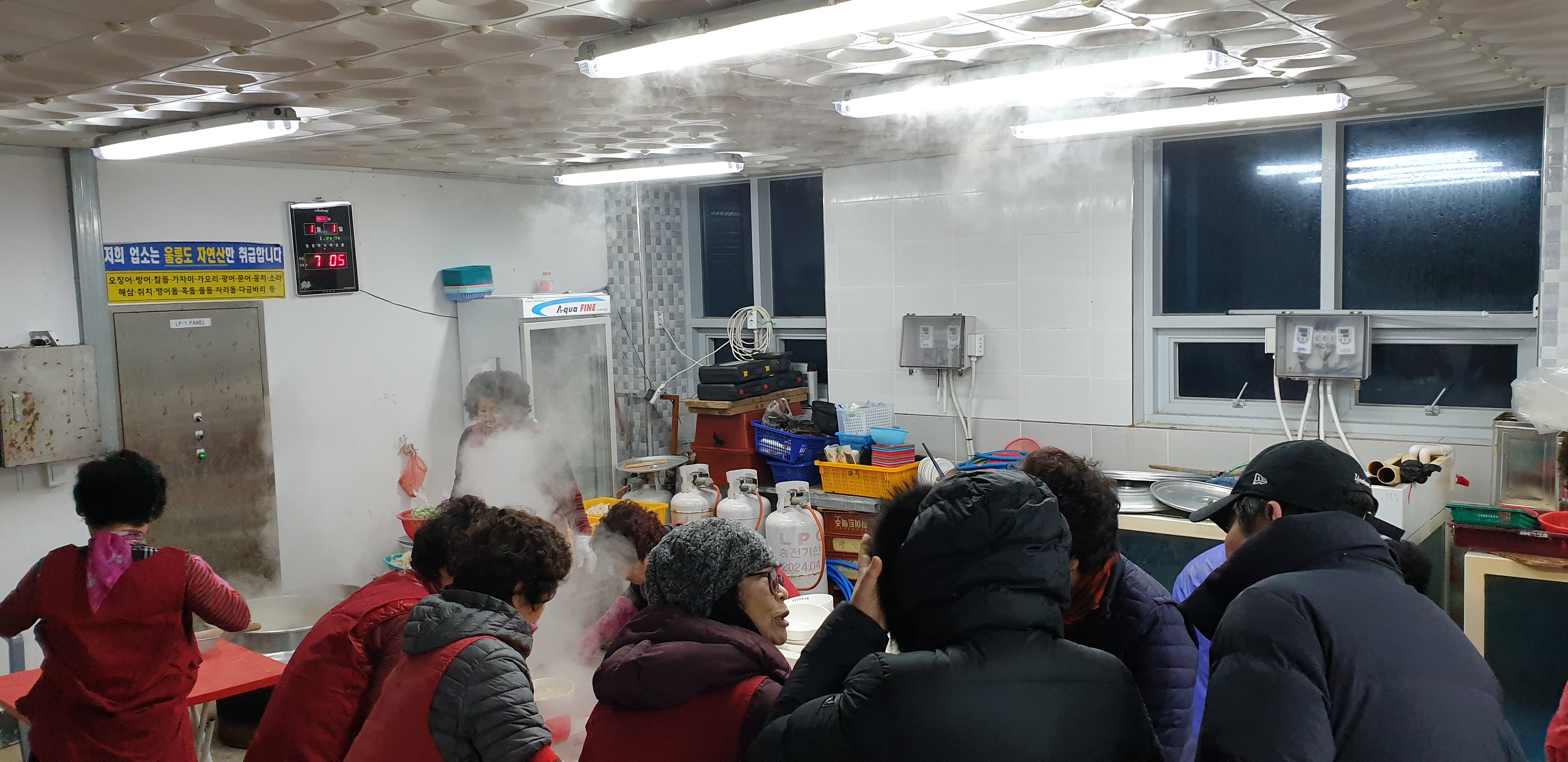 독도를 부속 도서로서 가지고 있는 울릉도 도동항에서는 많은 분들이 1월1일 도동 선주협회(오징어회센터 내) 부녀회에서 제공한 떡국을 한그릇 뚝딱! 드시고 해뜨는 “인생 명장면”을 보기 위해 터미널위 광장으로 모였습니다.