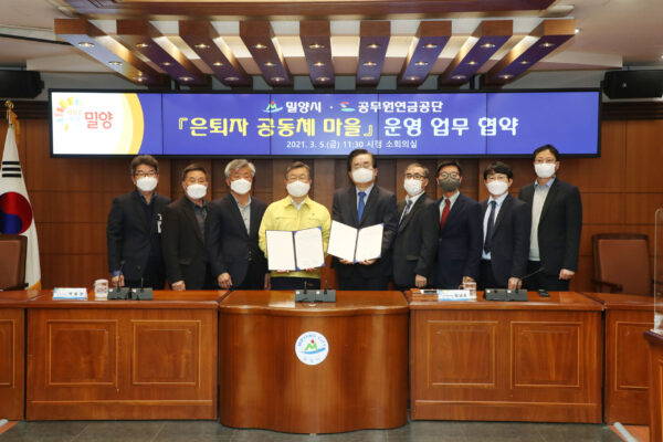 공무원연금공단(이사장 정남준, 이하 ‘공단’)은 밀양시와 5일 밀양시청에서 은퇴자 공동체 마을 운영을 위한 업무협약을 체결했다.