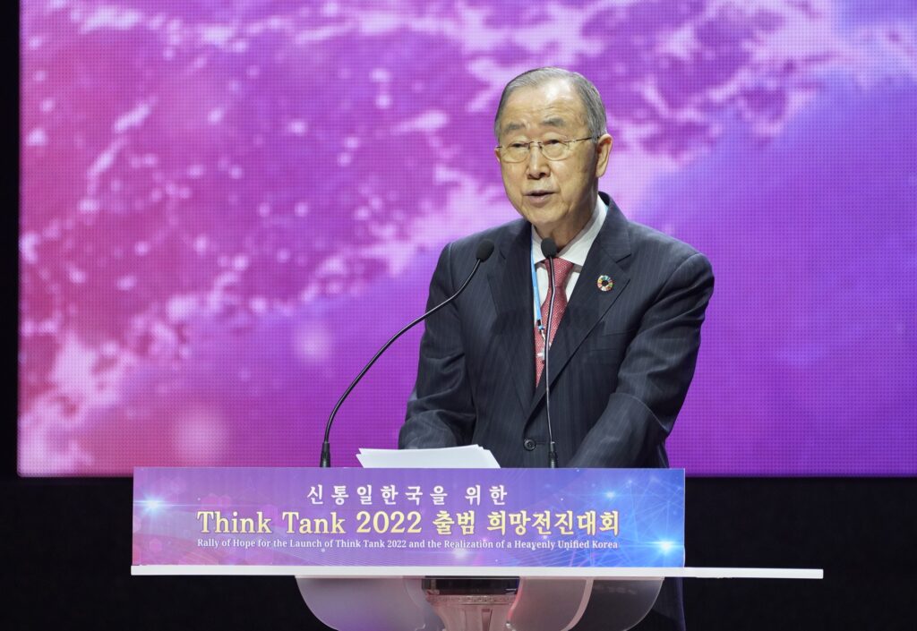 前 유엔 사무총장인 반기문 국가기후환경회의 위원장은 환영사에서 “세계 최고 전문가가 한반도 평화를 위해 ‘Think Tank 2020’를 출범하게 되어 한국인으로서 심심한 감사를 드리며, 본 네트워크는 국제적인 단결로 한반도의 평화를 위하여 변화를 일으킬 것이다”며, “유엔 사무총장 재임 시절 196개 당사국이 파리 기후변화협약에 서명한 기적을 통해 정부, 시민 사회 단체, 민간부문 대표, 이해 관계자들이 국가 자체 이익과 이념을 초월하는 공동목적을 공유하면 실질적이고 긍정적인 변화를 가져올 수 있는 사실을 알게 되었으며, 이 점에서 한학자 총재와 천주평화연합, 싱크탱크 2022를 지지하는 지도자들에게 박수를 보낸다”고 목소리를 높였다.