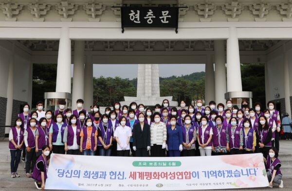 세계평화여성연합(회장 문훈숙, ‘이하 여성연합’)은 6월 호국보훈의 달을 맞아 순국선열과 호국영령의 숭고한 희생정신을 기리기 위하여 ‘당신의 희생과 헌신, 세계평화여성연합이 기억하겠습니다’라는 주제로 6월 28일 전국에서 같은 시간에 봉사활동을 진행했다.