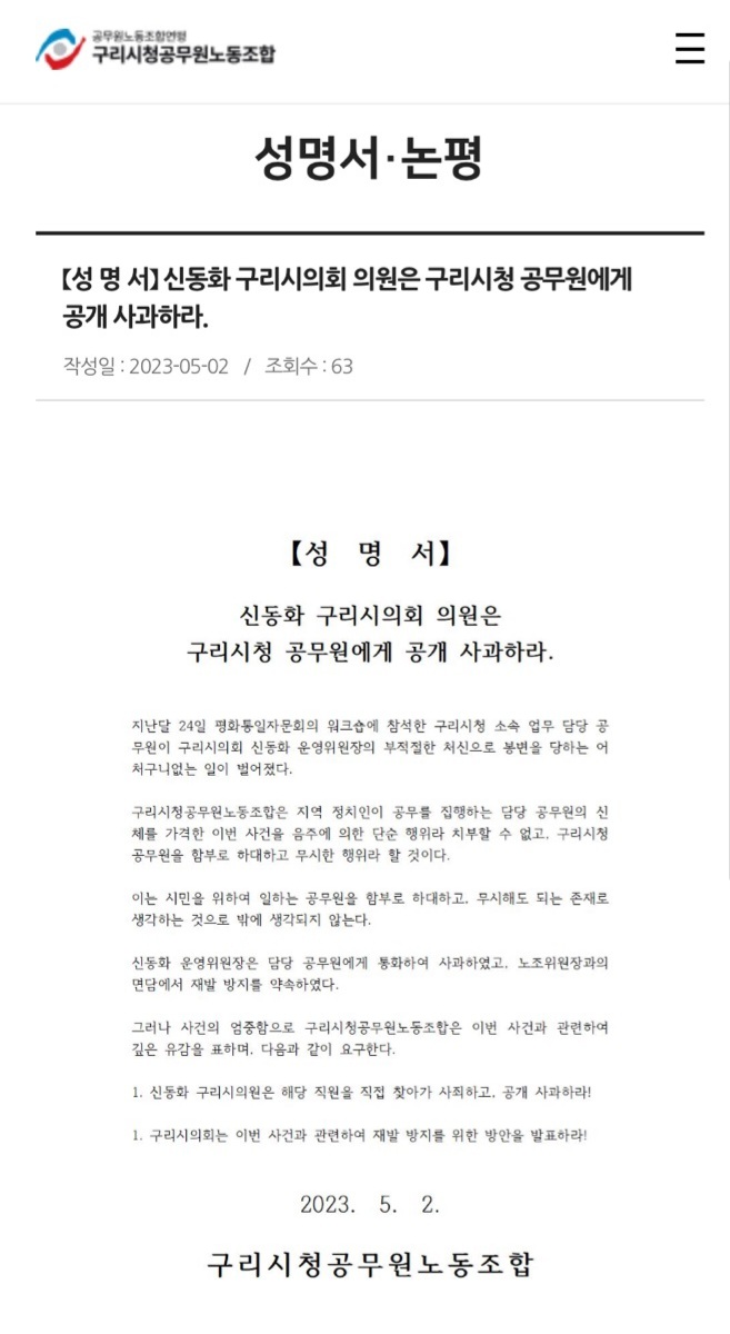 구리시청공무원노동조합은 지역 정치인이 공무를 집행하는 담당 공무원의 신체를 가격한 이번 사건을 음주에 의한 단순 행위라 치부할 수 없고, 구리시청공무원을 함부로 하대하고 무시한 행위라 할 것이다.
