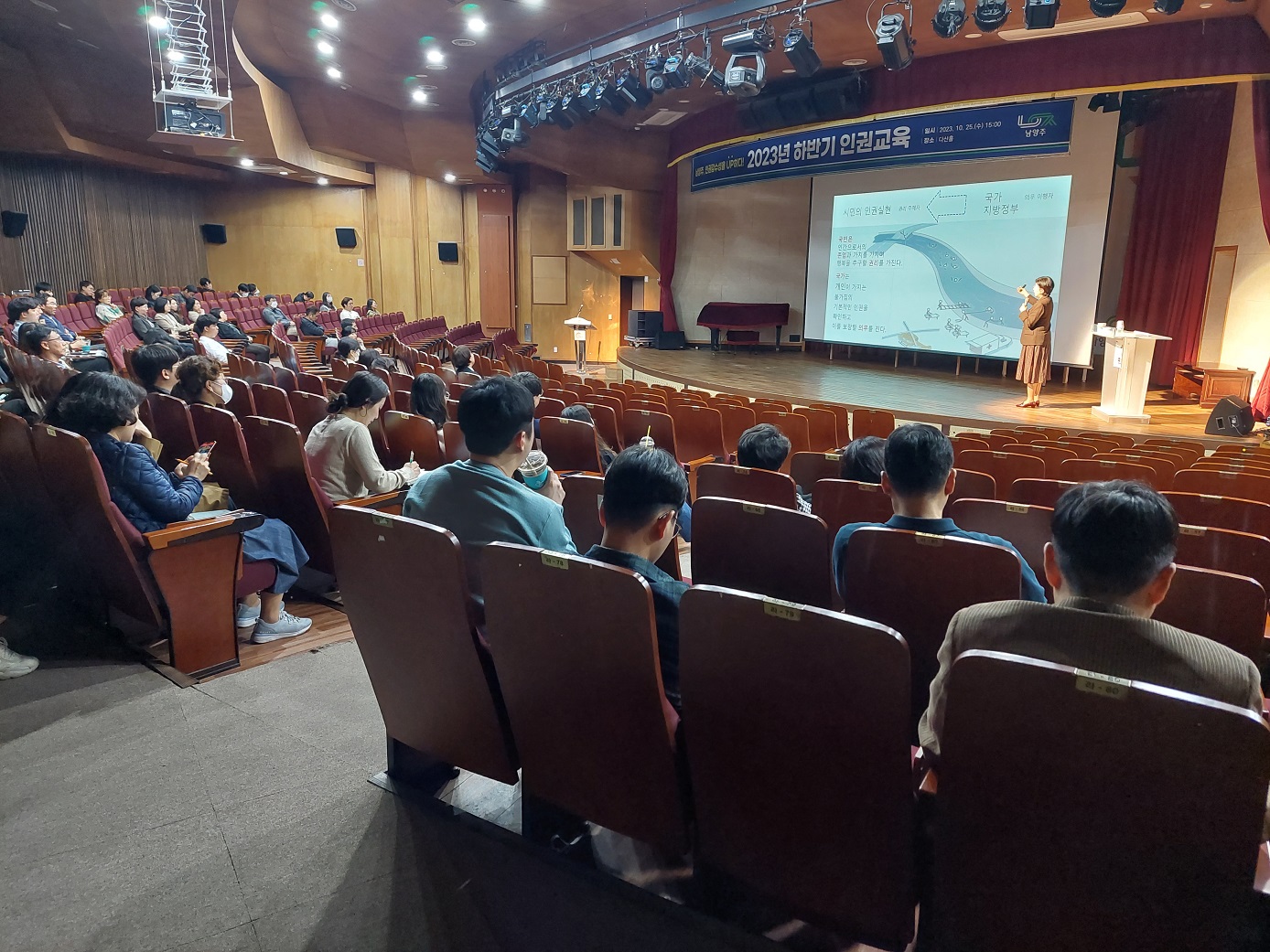 이날 교육을 맡은 손민원 국가 인권위원회 위촉 강사는 영화, 방송 등 다양한 시청각 자료를 활용해 인권 감수성 함양 및 인권 존중 조직문화 조성 방법에 대해 서로 소통하는 시간으로 진행했다.