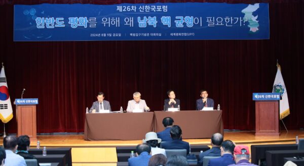 UPF(Universal Peace Federation, 세계평화연합, 세계의장 양창식)는 세종연구소 정성장 한반도전략센터장을 초청한 가운데 ‘한반도 평화를 위해 왜 남북 핵 균형이 필요한가’라는 주제로 ‘제26차 신한국포럼’을 8월 9일(금) 백범김구기념관 대회의실에서 진행하였다.
