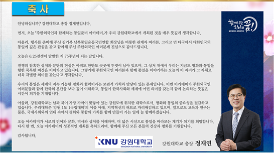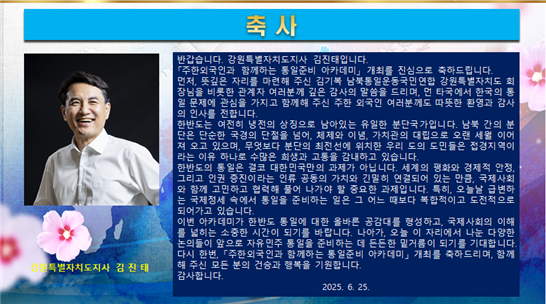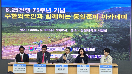 (사)남북통일운동국민연합 강원특별자치도회(회장:김기복)는 지난 6월 25일, 오후 2시에 6.25전쟁 75주년을 기념하여 강원대학교 서암관에서 70여명의 각계 지도자들이 참석한 가운데 ‘주한 외국인과 함께하는 통일준비 아카데미’를 개최하였다. 이번 행사는 통일부 민간단체 지원사업으로 통일에 대한 국제적 공감대를 넓히고 다양한 국적의 참가자들과 소통을 통해 통일 준비의 새로운 방향을 모색하기 위해 마련됐다.