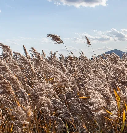 ☞ ‘갈대’는 물가 습지에서 자라고, ‘억새’는 산언덕 마른 땅에서 자랍니다. ‘억새풀은’ 멀리서 보면 몽실몽실 흰구름 모양으로 보이지만 ‘갈대’는 약간 보라색으로 비단결처럼 잘 정리된 모습으로 보입니다. 필자가 12살 봄까지 보낸 고향 부산 명지 영강리는 낙동강 하구 조그마한 농촌과 어촌마을로 철새들의 낙원이었고, 또한 갈대가 많이 자랐습니다. 그 곳에서는 갈매나무를 베어 지붕도 엮었고, 담장도 만들었으며, 정월대보름 날에는 마을 어른신들께서 낙동강 제방뚝에 커다랗게 달집을 만들어 놓고 주위를 빙빙 돌면서 소원을 빈 후 달집태우기를 하시기도 했습니다. 그리고 부드럽게 자라난 갈대꽃 부분은 뽑아서 방과 부엌용 빗자루로 만들어 사용하였습니다. 봄에는 “깔품”이라 불리는 갈매 순(筍)을 간식거리로 먹으면서 갈대밭 사이를 뛰어 놀았던 그 어린시절이 그립습니다.