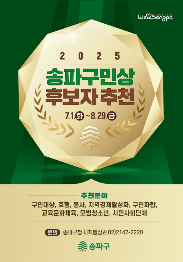 -송파구(구청장 서강석)가 오는 8월 29일까지 ‘2025년 송파구민상’ 후보자를 추천받는다고 밝혔다.