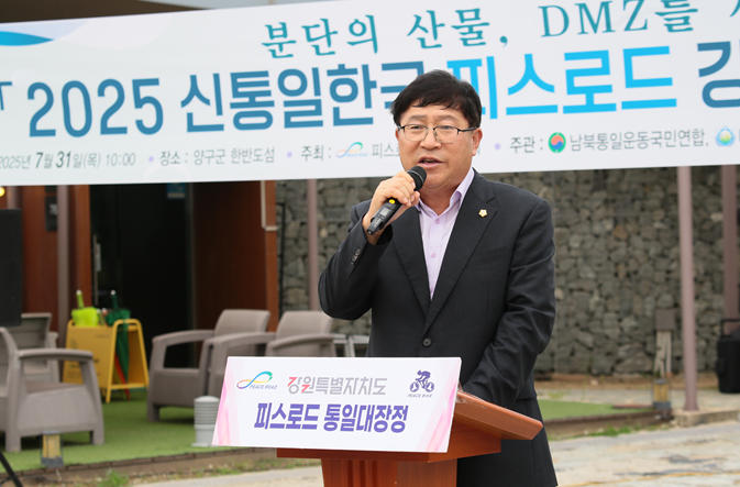 정창수 군의회 의장은 환영사를 통해 “우리 민족의 최고의 가치와 이상은 평화통일라고 생각한다며 2025피스로드 강원특별자치도 통일대장정 행사가 분단지역 양구에서 출발한 것은 특별한 의미가 있다고 생각하며 분단의 아픔이 가장 깊게 서려 있는 이 양구를 그 출발점으로 선택해 주신 주최측에 양구군민을 대표하여 감사하다는 고마움을 표하였다. 누가 뭐래도 우리의 소원은 통일이며 통일이라는 가치는 어떤 것과도 바꿀 수가 없는 우리의 현실이자, 미래이자, 꿈이며 통일문제에 있어서는 여야가 따로 있을 수 없고 종교적인 편견도 있을 수가 없고 남북이 따로 있을 수가 없다며 통일의 의지를 가지고 양구를 찾아주신 것에 대하여 깊은 감사의 인사를 전했다.