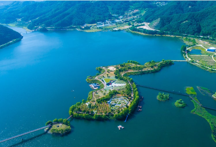 한반도 섬은 실제의 한반도를 13,000평으로 축소해 놓은 인공섬으로 의미있게도 이미 통일이 이루어진 상태로 남북을 왕래할 수 있는 한반도 섬 둘레길을 걸으며 통일의 필요성과 가치를 느껴 볼 수 있는 명소이기도 하다.