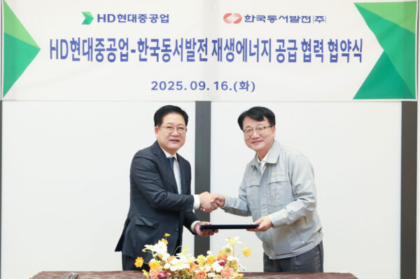 HD현대중공업은 16일(화) 울산 본사에서 HD현대중공업 노진율 사장, 한국동서발전 권명호 사장이 참석한 가운데 한국동서발전과 ‘재생에너지 공급 업무 협력 협약’을 체결했다.