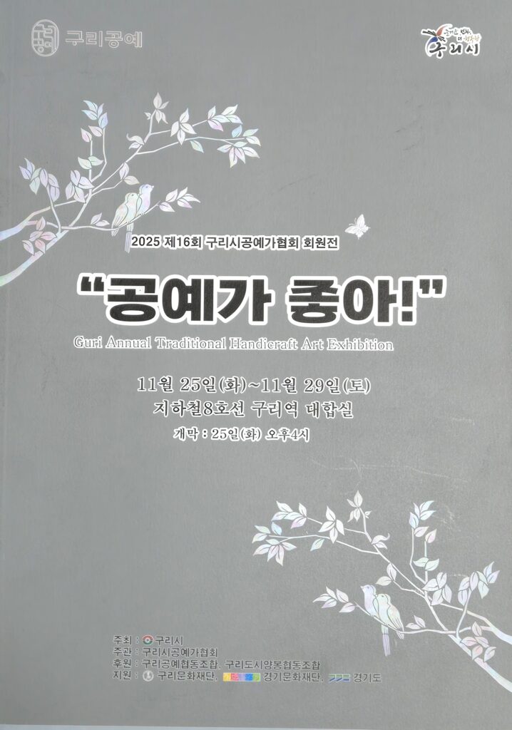 구리시(시장 백경현)와 구리시 공예가협회(회장 서인석)는 11월 25일부터 29일까지 지하철 8호선 구리역 맞이방에서 ‘공예가 좋다’를 주제로 한 회원전을 개최하고 있다.