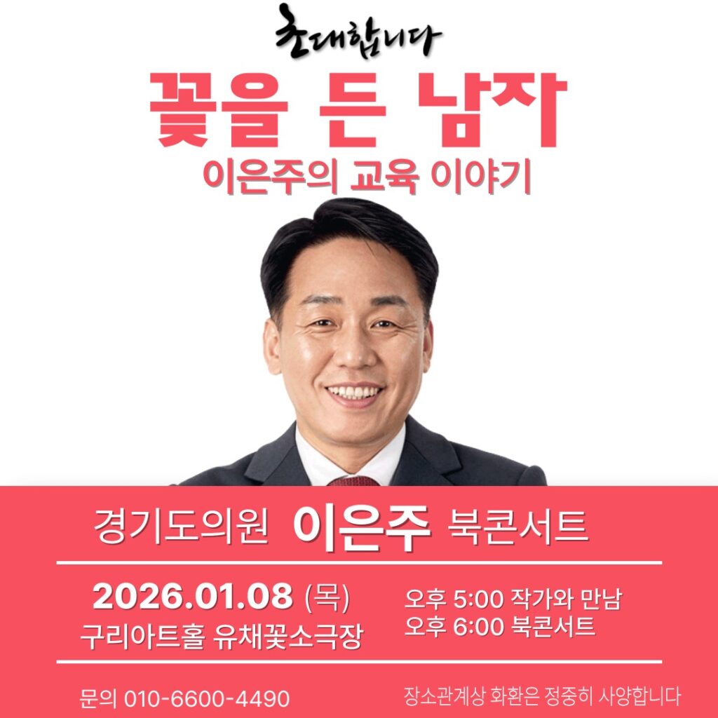 경기도의회 교육행정위원회 이은주 의원(국민의힘, 구리2)이 저서 『꽃을 든 남자 이은주의 교육 이야기』를 출간, 오는 1월 8일(목) 오후 6시, 구리아트홀 유채꽃소극장에서 책에 담긴 교육 철학을 주민들과 나누는 북콘서트를 연다.