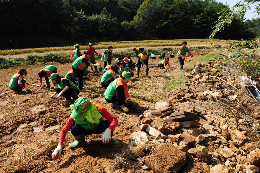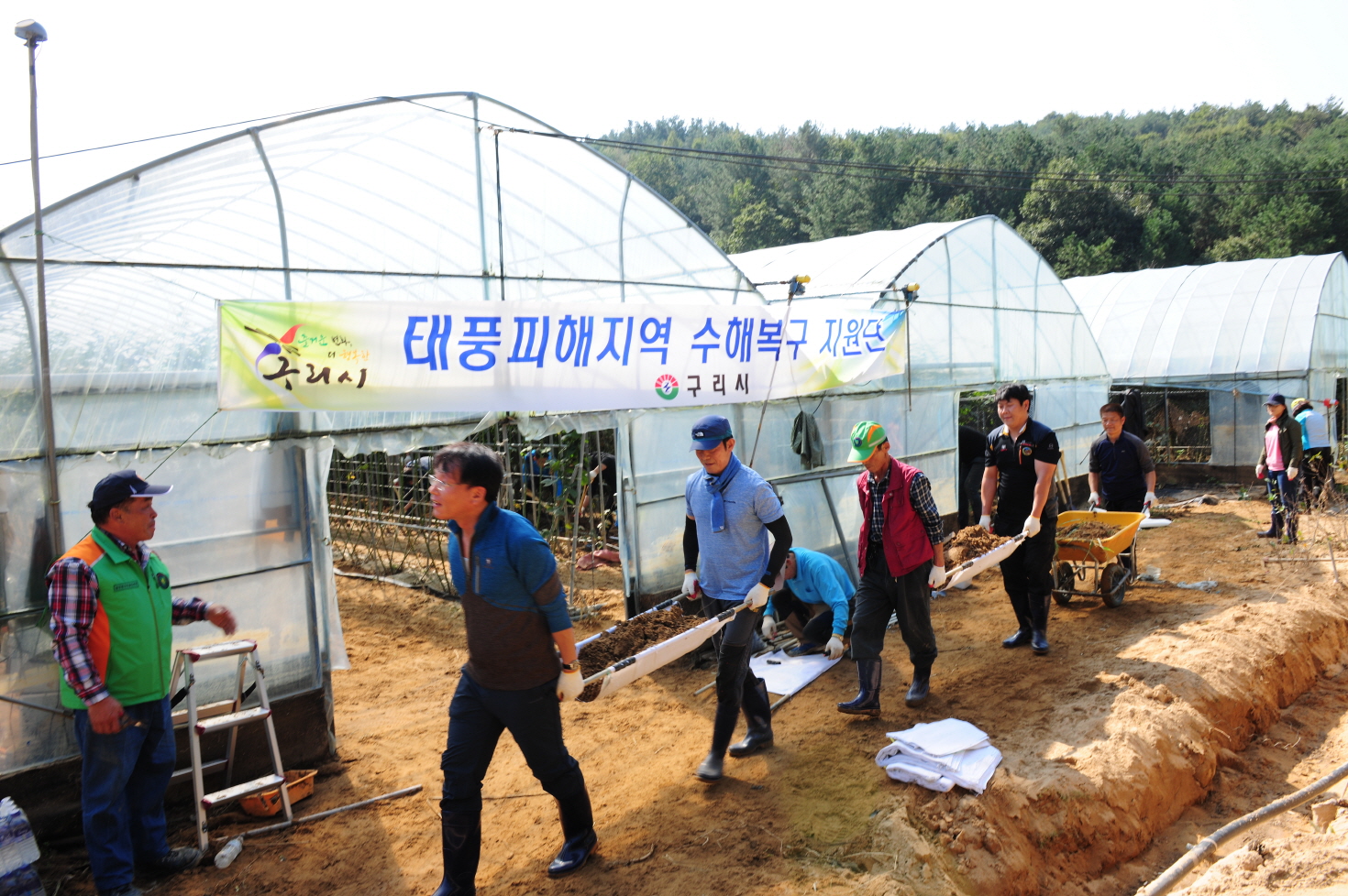 이날‘구리시 지원단’은 부쩍 쌀쌀해진 날씨에도 불구하고 침수피해가 큰 울산시 북구청 농소3동 상안마을의 수해 복구 작업을 위해 비닐하우스 농가를 찾아 유실된 논660㎡에 산재해 있는 돌덩이 제거 작업과 복분자 비닐하우스 농가 5동 3,000㎡의 황토 뻘 및 논에 쌓인 폐기물 등 주변 잔해 정리로 구슬땀을 흘렸다.