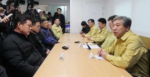 경기도의회 송한준 의장(더민주, 안산1)을 비롯한 의원들이 12일 ‘우한교민’이 임시로 생활하게 될 이천지역을 방문해 마을주민들과 현장근무자들을 격려했다.