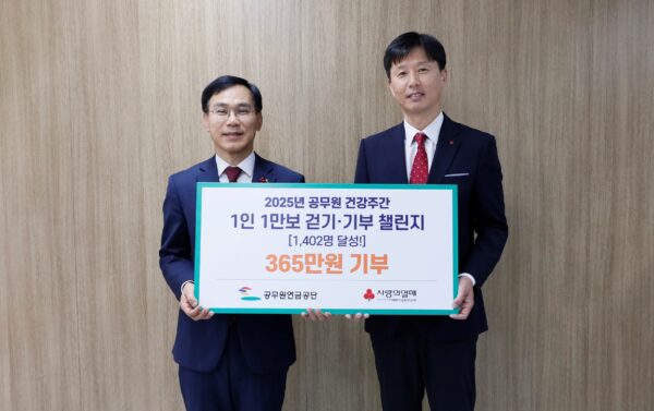 공무원연금공단(이사장 김동극, 이하 공단)은 ‘2025년 공무원 건강주간’을 맞아 진행한 「365 걷기·기부 챌린지」의 목표달성 기부금 365만 원을 사회복지공동모금회 ‘사랑의 열매’에 전달했다고 23일 밝혔다.