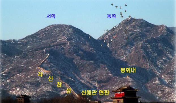 참고로 만리장성의 동단(東端)으로 알려져 있는 산해관 장성은 천하제일관(天下第一關)의 현판, 화살구, 봉화대의 방향으로 볼 때 동쪽 사람이 서쪽에서 오는 적을 방비하기 위해 쌓은 장성임을 알 수 있다. 바닷가에서 시작되는 산해관 장성은 평지를 지나다가 각산(角山)에서부터 산속을 지나 북경까지 이어진다.