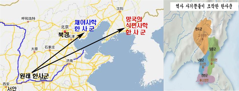 그런데 180년 후에 나온 반고의 <한서>에 “마침내 조선을 멸해 낙랑·현토·임둔·진번으로 했다” 즉 조선을 평정(定)했다는 것이 조선을 멸망(滅)시킨 것으로 바뀌며, 위 자치령 조선오군(홰청·적저·평주·기·온양)이 조선5군의 제후들의 이름까지 삭제해가며 식민지 한사군(낙랑·현토·임둔·진번)으로 둔갑하게 되는 것이다. 한마디로 한사군은 한족 사가(漢族史家)들의 붓장난과 말장난에 불과한 것이다.