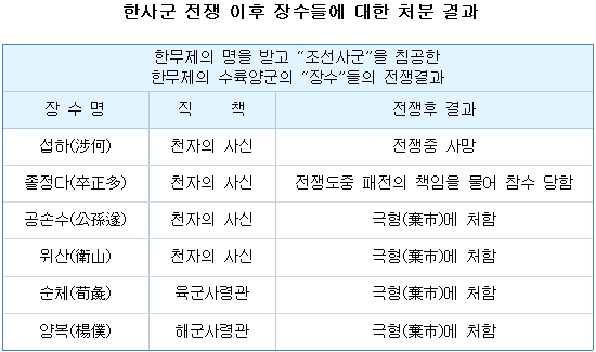 당시 무제가 보낸 한나라 군대는 번조선의 우거왕에게 연전연패하여 거의 전의를 상실하고 있었다. 또한 우거의 신하들은 한나라 군대의 공격을 잘 막아내 이겼으면서도 오히려 겁을 냈으며, 이 전쟁이 제발 빨리 끝나기를 바라고 있었다. 한나라가 마지막으로 총공격을 해오자, 우거의 신하들은 자신들의 왕을 죽이고 한나라에 투항해버린다. 이로써 이 전쟁은 끝이 났으나 승자는 없고 패자만 남은 전쟁이었다.