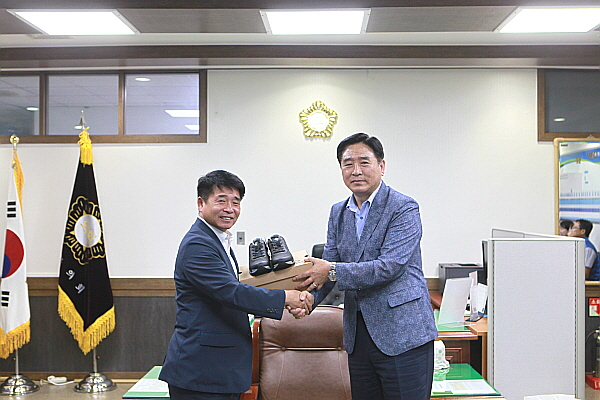 최우용 조합장은 축하 인사와 함께 ‘가평군 발전과 군민을 위해 열심히 뛰어 달라’는 의미를 담아 송기욱 의장에게 운동화를 선물했다.