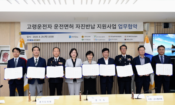 경기도는 29일, 도 북부청사 상황실에서 도의회, 경기남·북부지방경찰청, 시장·군수협의회, 도로교통안전공단, 손해보험협회, 대한노인회와 「고령운전자 운전면허 자진반납자 지원사업」에 관한 업무협약을 체결하였다.