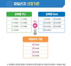승용차마일리지는 최초 누적주행거리와 1년 후 최종 누적주행거리를 비교해 실질적 감축을 실천했을 경우 지급이 가능하며 주행거리 감축률과 감축량을 기준으로 0~10%, 0~1000km 감축 시 2만 포인트부터 최대 30% 이상 3000km 감축 시 7만 포인트까지 차등 지급된다.