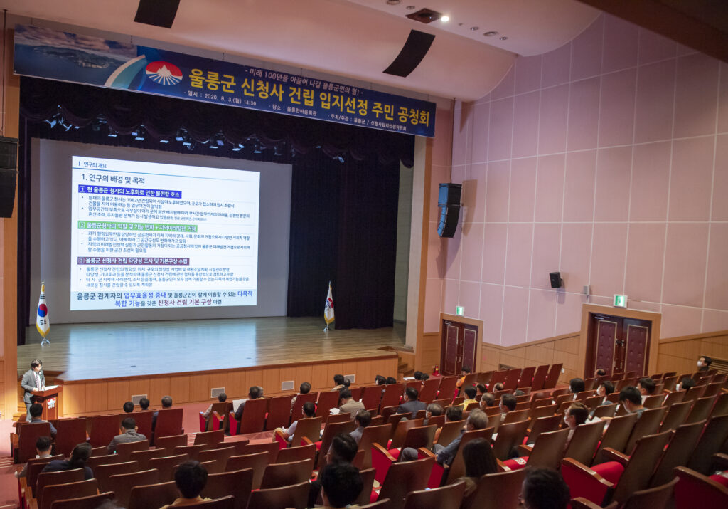울릉군(군수 김병수)은 8월 3일 울릉한마음회관 대공연장에서 울릉군 신청사 구상 및 타당성 조사 용역 중간 보고회와 함께 주민공청회를 개최하였다고 밝혔다.