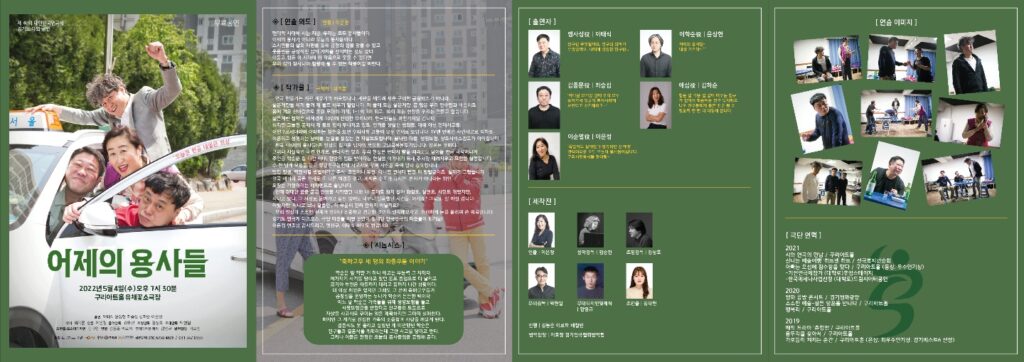 연극 “어제의 용사들”는 “극단 마중물”의 공연으로 작가 위기훈, 연출 이은정, 음악감독 김승진, 조명감독 김상호, 무대감독은 박현일, 배우 이태식,윤상현, 최승집, 김하순, 인은정이 출연한다.