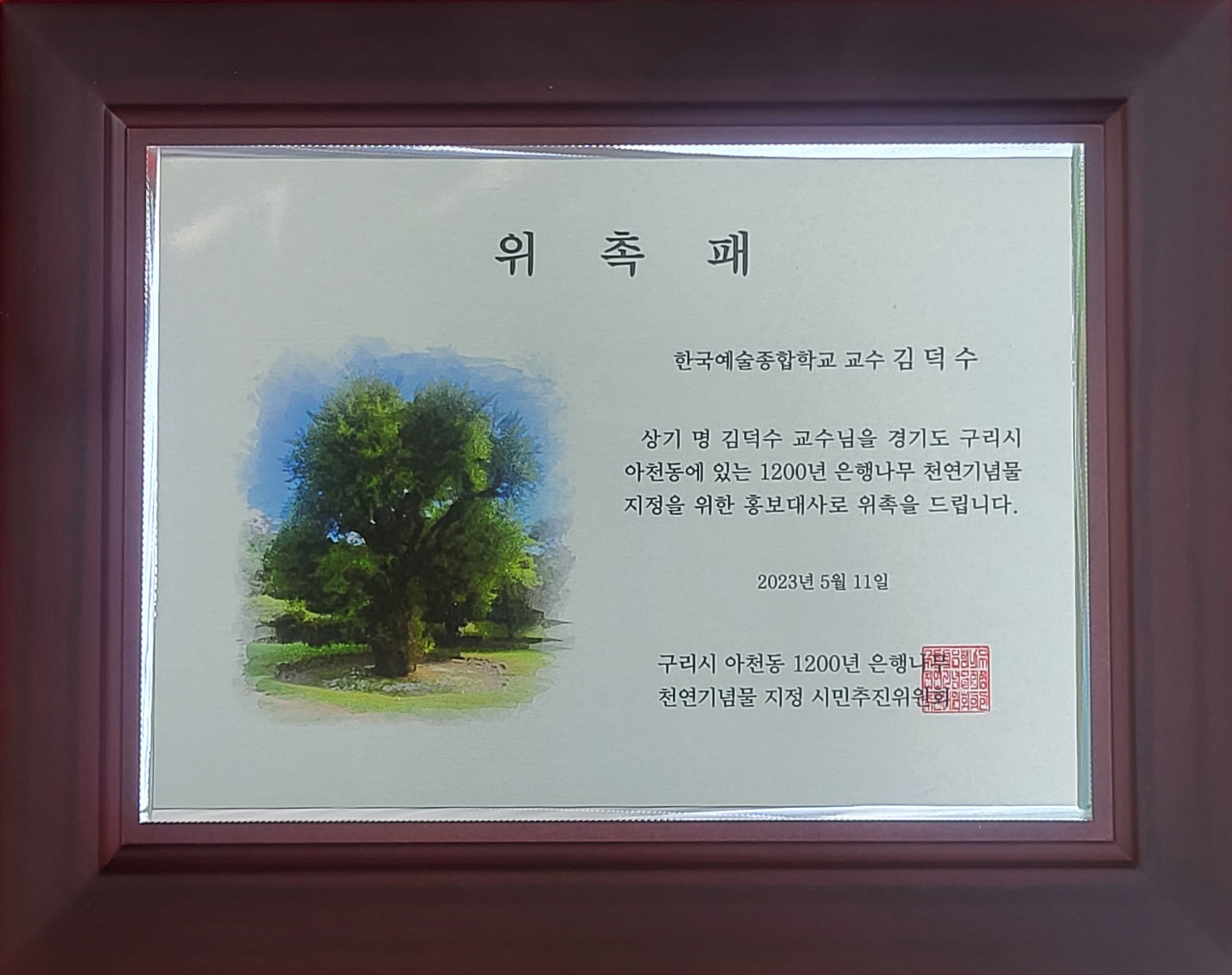 특히, 5월 11일 오후 1시에 허득천 상임대표는 서울 혜화동의 세계적으로 유명한 대한민국의 사물놀이의 창안자이자, 공연과 후학 지도로 유명한 김덕수 교수의 연습실을 방문해 ‘구리시 아천동 1200년 은행나무 천연기념물 지정 추진위의 홍보대사’ 위촉을 하였고 , 남상화, 이선자 이사도 함께 홍보대사 위촉식을 동행했다.