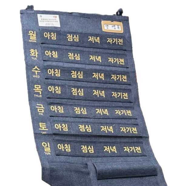 보호자 없이 혼자 생활하시며 기억력이 저하된 고령 어르신들이 일상생활을 하며 약 복용 여부를 체크할 수 있도록 월~일요일과 아침, 점심, 저녁, 자기 전 등이 인쇄되어 있다.