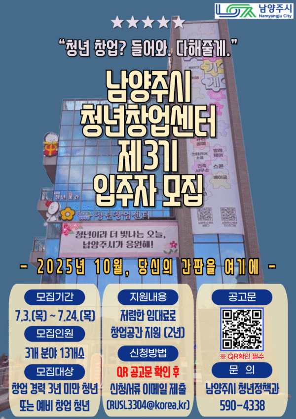 시는 이번 모집을 계기로 성장 가능성 있는 청년 창업가에게 실질적인 창업 지원을 제공함으로써, 청년들이 부담 없이 창업에 도전하고 자립하여 꿈을 펼칠 수 있기를 기대하고 있다. 신청은 7월 3일부터 7월 24일 오후 6시까지이며, 남양주시 청년정책과 담당자 이메일(RUSL3304@korea.kr)로 사업계획서 및 관련 서류를 제출하면 된다.