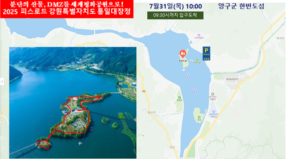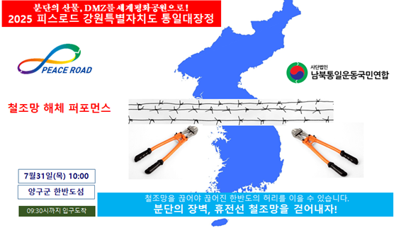 (사)남북통일운동국민연합이 주관하고 통일부와 17개 광역 시‧도를 포함한 전국 50여개 단체 및 공공기관에서 후원하는 ‘2025피스로드 통일대장정’ 행사가 지난 7월 15부터 전국 광역시‧도 및 시‧군에서 순차적으로 진행되고 있는 가운데, 강원특별자치도에서도 피스로드 통일대장정 행사가 ‘휴전선 철조망 해체 퍼포먼스’와 함께 국토의 정중앙 양구군 한반도섬에서 개최될 예정이다.