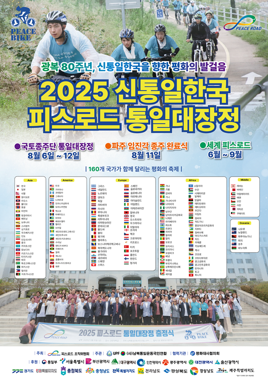 올해는 광복 80주년이자, 새로운 통일비전 실현의 분수령이 되는 해다. 이를 앞두고 펼쳐지는 ‘2025 피스로드 통일대장정’은 전 세계 청년들의 열정과 평화의 의지를 모아 통일과 세계평화의 길을 함께 열어간다는 각별한 의미를 담고 있다. 이에 따라 올해로 13년째를 맞는 피스로드 통일대장정은 ‘광복 80주년, 신통일한국을 향한 평화의 발걸음’을 주제로, 세계 160개국에서 청년과 시민 40만여 명이 참여할 예정이다. 오는 8월 11일에는 파주 임진각에서 ‘2025 피스로드 종주완료식’이 열리며, 국내외 주요 지도자들과 청년 참가자들이 함께 모여 한반도의 평화로운 미래를 설계하는 굳은 결의를 다질 예정이다. 각 지역에서 열리는 구간별 출발식에서는 평화 메시지 낭독과 자전거 출발 세레모니가 진행되며, 남북통일을 열망하는 회원 및 평화대사 등 각계 인사들이 참여해 통일에 대한 국민적 공감대를 확산시키는 계기를 마련할 것이다.