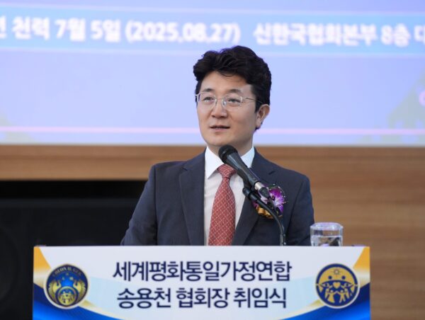 세계평화통일가정연합(이하 가정연합, 통일교)은 지난 27일 서울 용산구 한국본부 대강당에서 가정연합 21대 송용천 한국협회장 취임식을 가졌다고 밝혔다. 이날 취임식에는 문연아 선학학원 이사장, 문훈숙 효정한국문화재단 이사장, 두승연 세계선교본부장, 도현섭 미래양성원장, 이기성 천심원장, 조만웅 원로목회자회장과 가정연합 전국 목회자 등 300여 명이 참석했다.