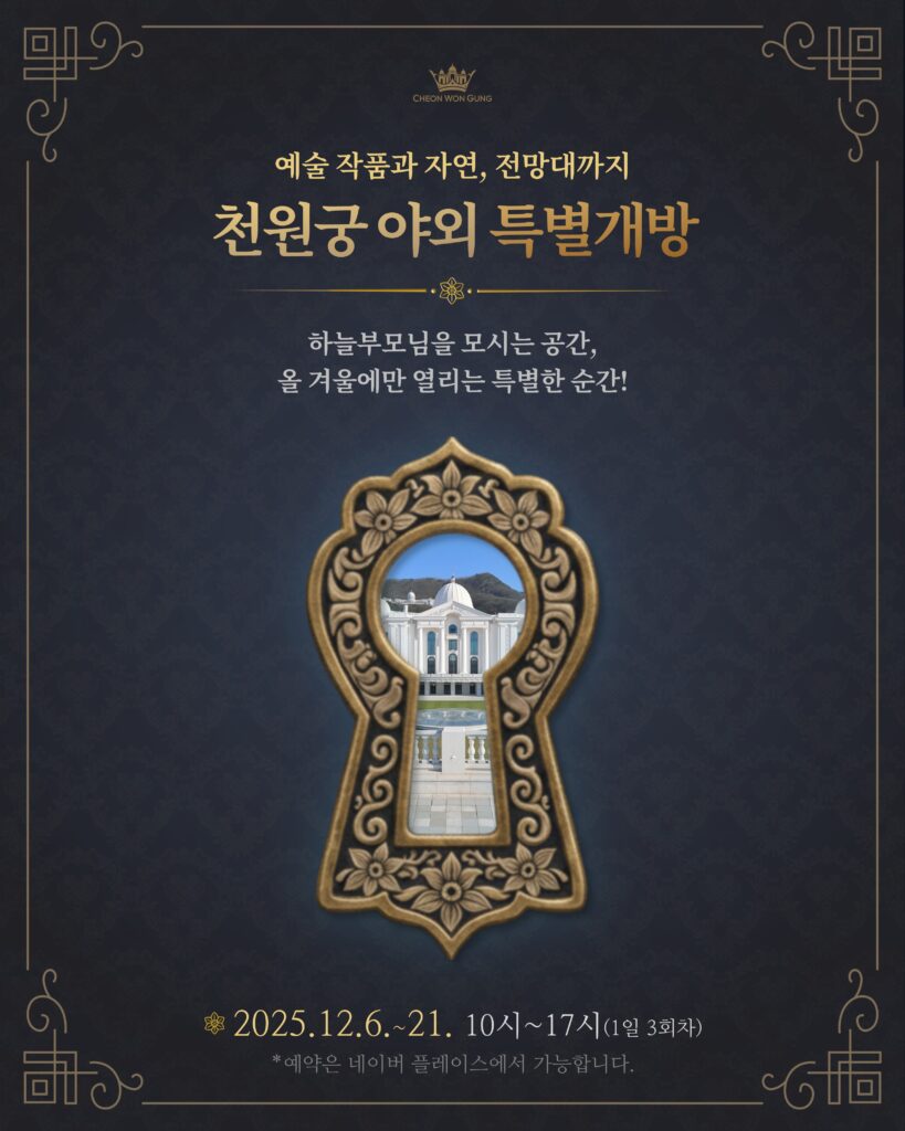 천원궁 이번 개방 기간에는 내부가 아닌 천일성전 외곽 공간, 전망 데크, 예술 조각 정원, 순례 산책로 일부 구간 등이 공개될 예정이다.