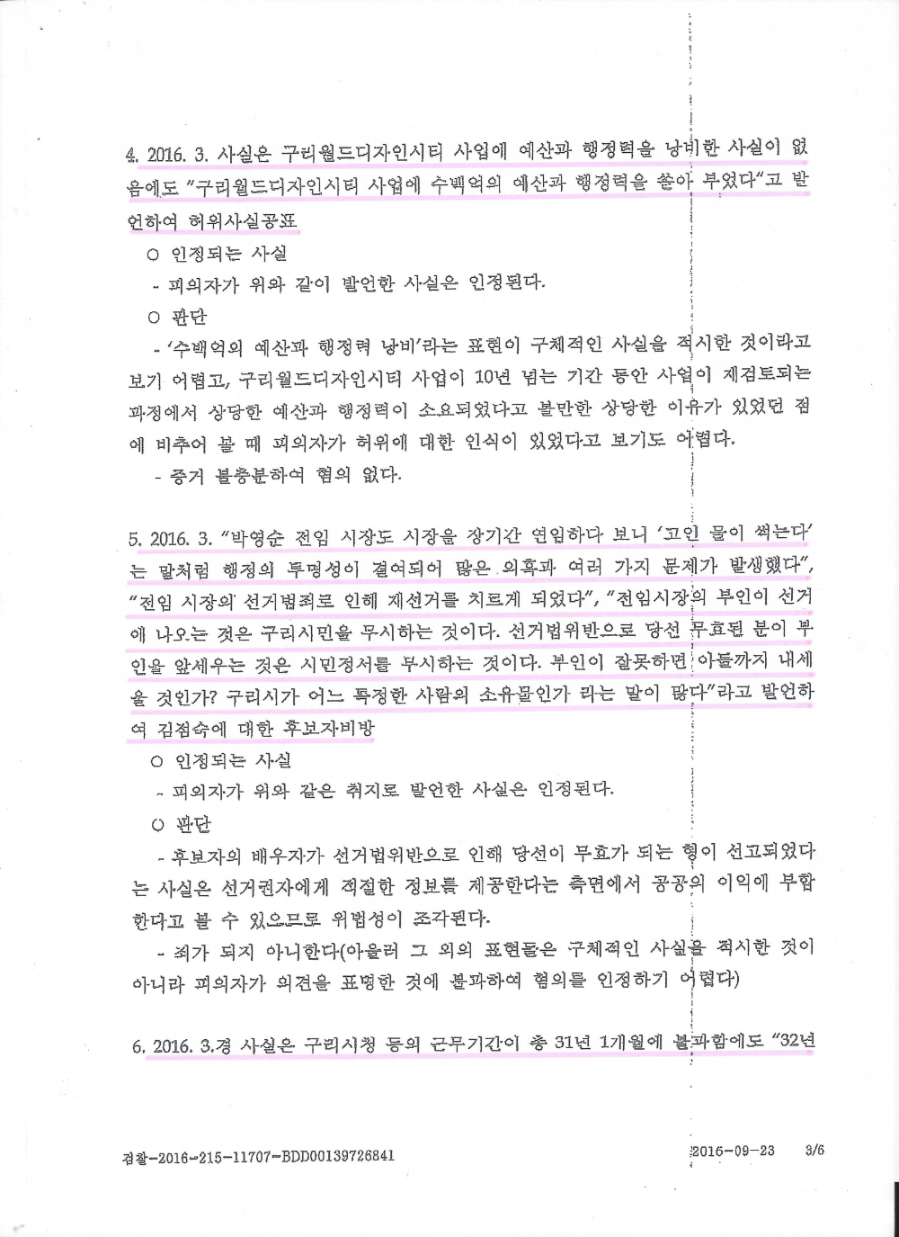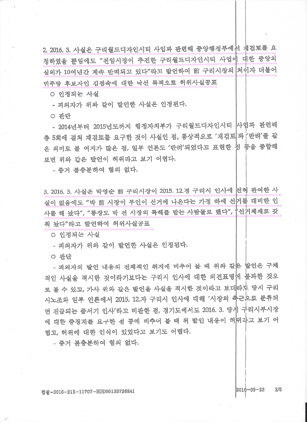 2. 2016. 3. 사실은 구리월드 디자인시티사업과 관련해 중앙행정부에서 재검토를 요청하였을 뿐임에도 “전임 시장이 추진한 구리월드 디자인시티사업에 대한 중앙의 심의가 10여년간 계속 반려되고 있다”라고 발언하여 前 구리시장의 처이자 더불어 민주당 후보자인 김점숙에 대한 낙선 목적으로 허위사실 공표건