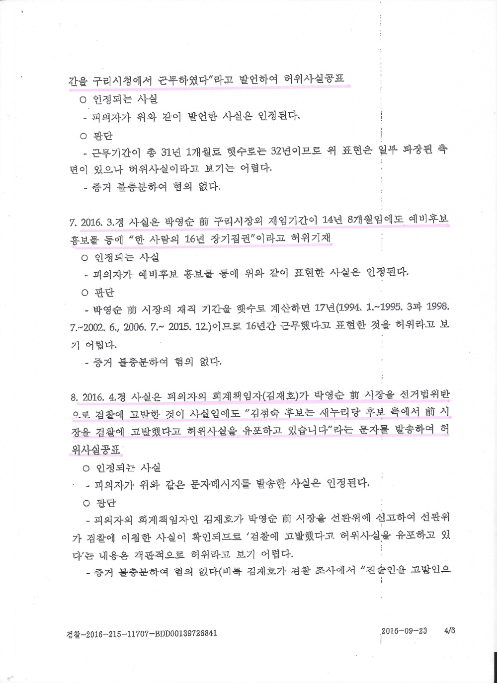 7. 2016.3. 경 사실은 박영순 전 구리시장의 재임기간이 14년 8개월임에도 예비후보 홍보를 통해 “한사람의 16년 장기집권”이라고 허위기재 건