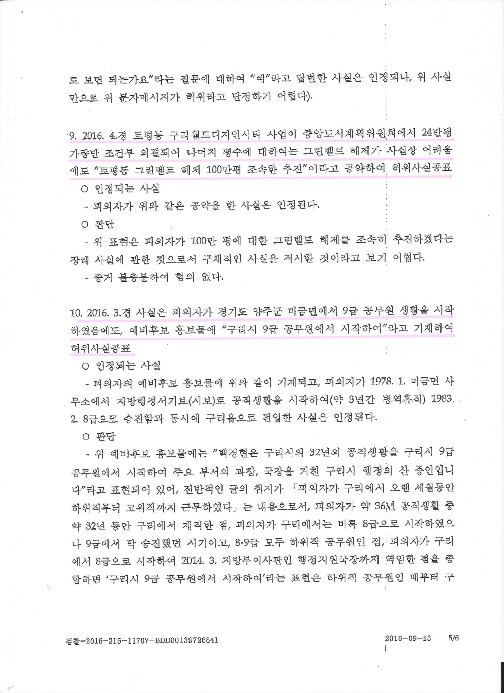 10/ 2016.3. 경 사실은 피의자가 경기도 양주군 미금면에서 9급 공무원 생활을 시작하였음에도, 예비후보 홍보물에는 “구리시 9급 공무원에서 시작하여”라고 기재하여 허위사실 공표 건