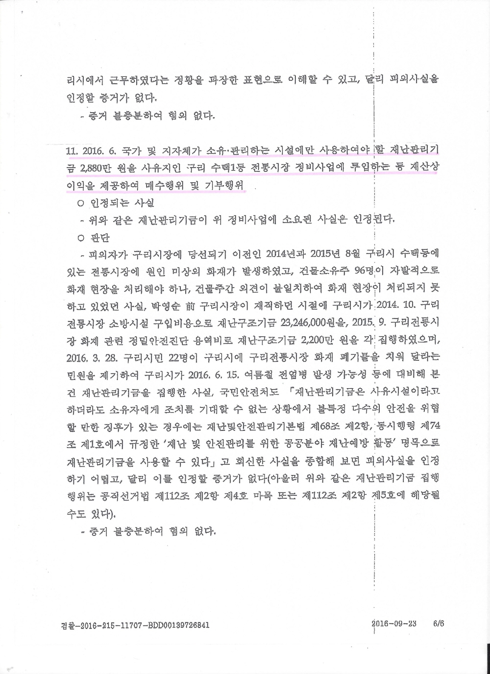 11. 2016.6. 국가 및 지자체가 소유,관리하는 시설에만 사용하여야 할 재난관리기금 2,880만 원을 사유지인 구리 수택 1동 전통시장 정비사업에 투입하는 등 재산상 이익을 제공하여 매수행위 및 기부행위 건